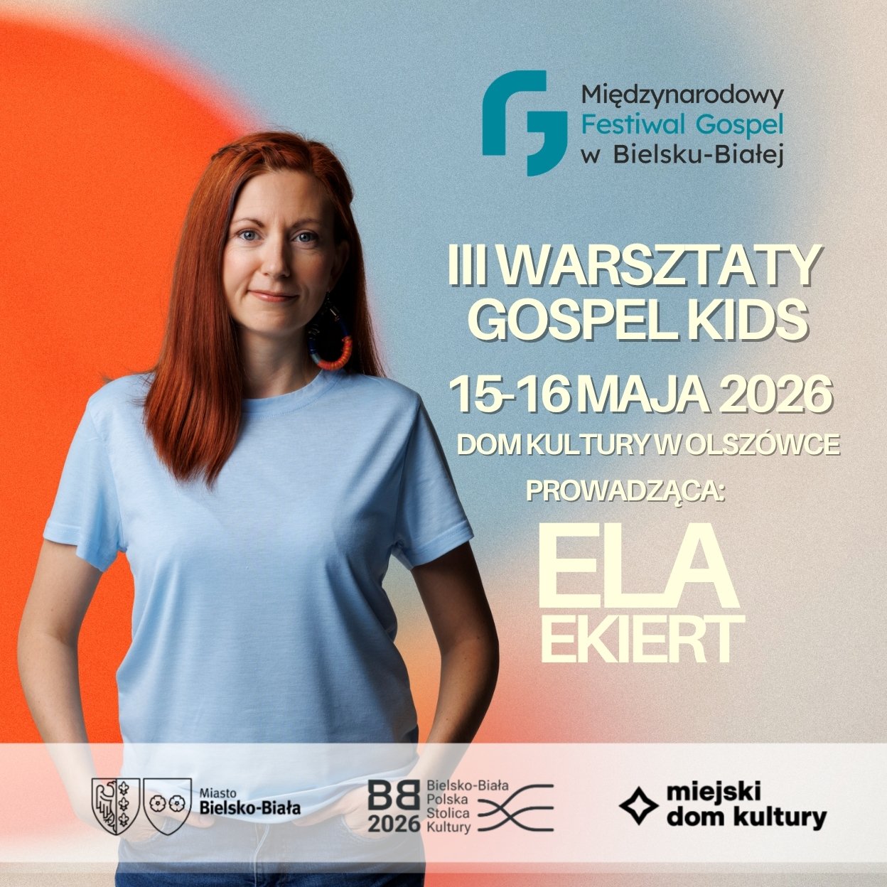 Warsztaty poprowadzi Ela Ekiert-Pyzik – wokalistka, dyrygentka i pedagog. Jest absolwentką wokalistyki jazzowej Akademii Muzycznej w Katowicach oraz neurologopedą. Na co dzień prowadzi krakowski Mistral Gospel Choir, z którym wykonuje także autorskie kompozycje. W swojej pracy z głosem łączy doświadczenie muzyczne i terapeutyczne, szukając holistycznych sposobów rozwijania potencjału wokalnego. Traktuje śpiew nie tylko jako sztukę, ale także jako formę komunikacji, budowania relacji i wspierania rozwoju dzieci.